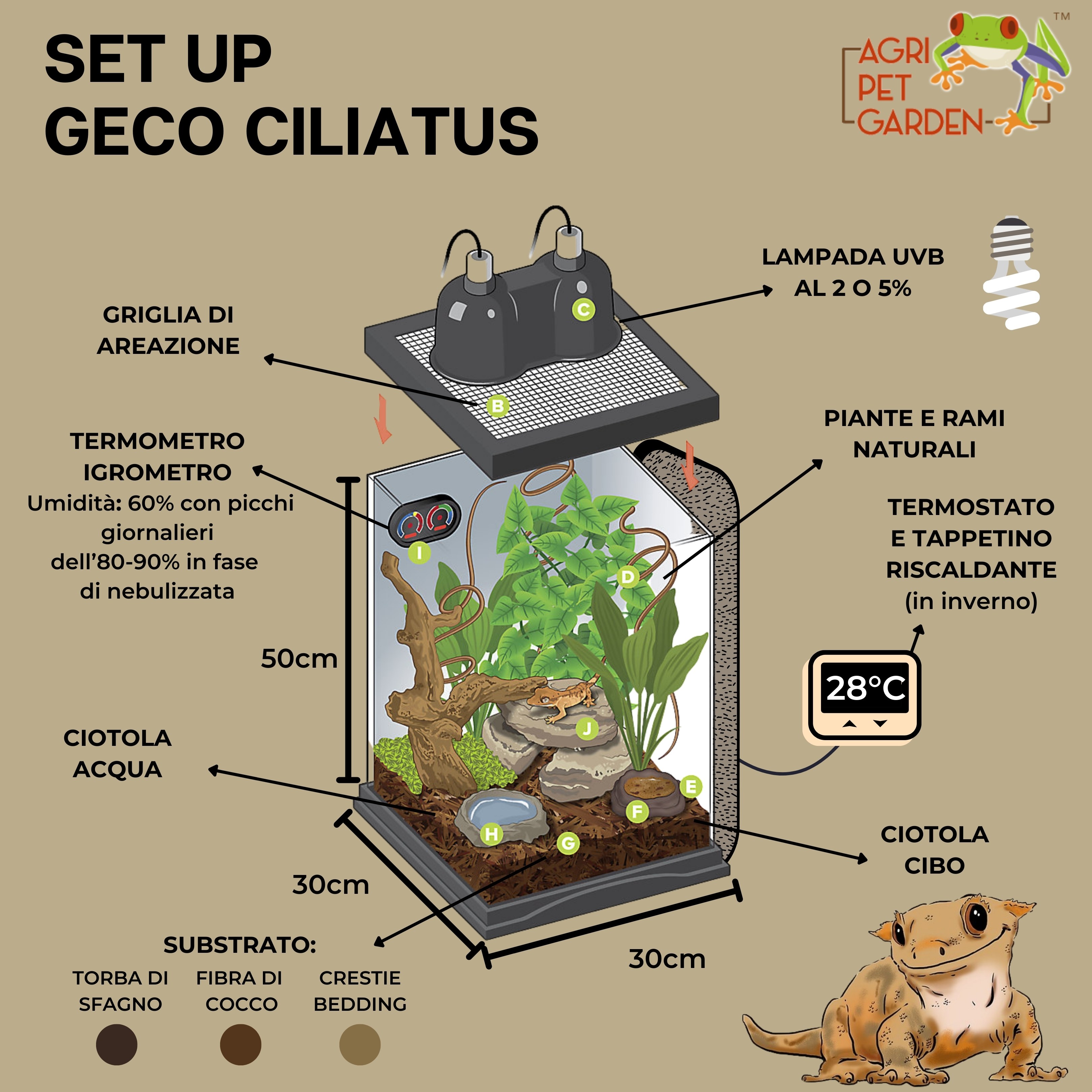 Il nostro consiglio: Un terrario arredato in maniera naturalistica, con un substrato di torba o fibra di cocco, con l’inserimento di piante vere vi aiuterà a mantenere un corretto e più uniforme livello d’umidità.