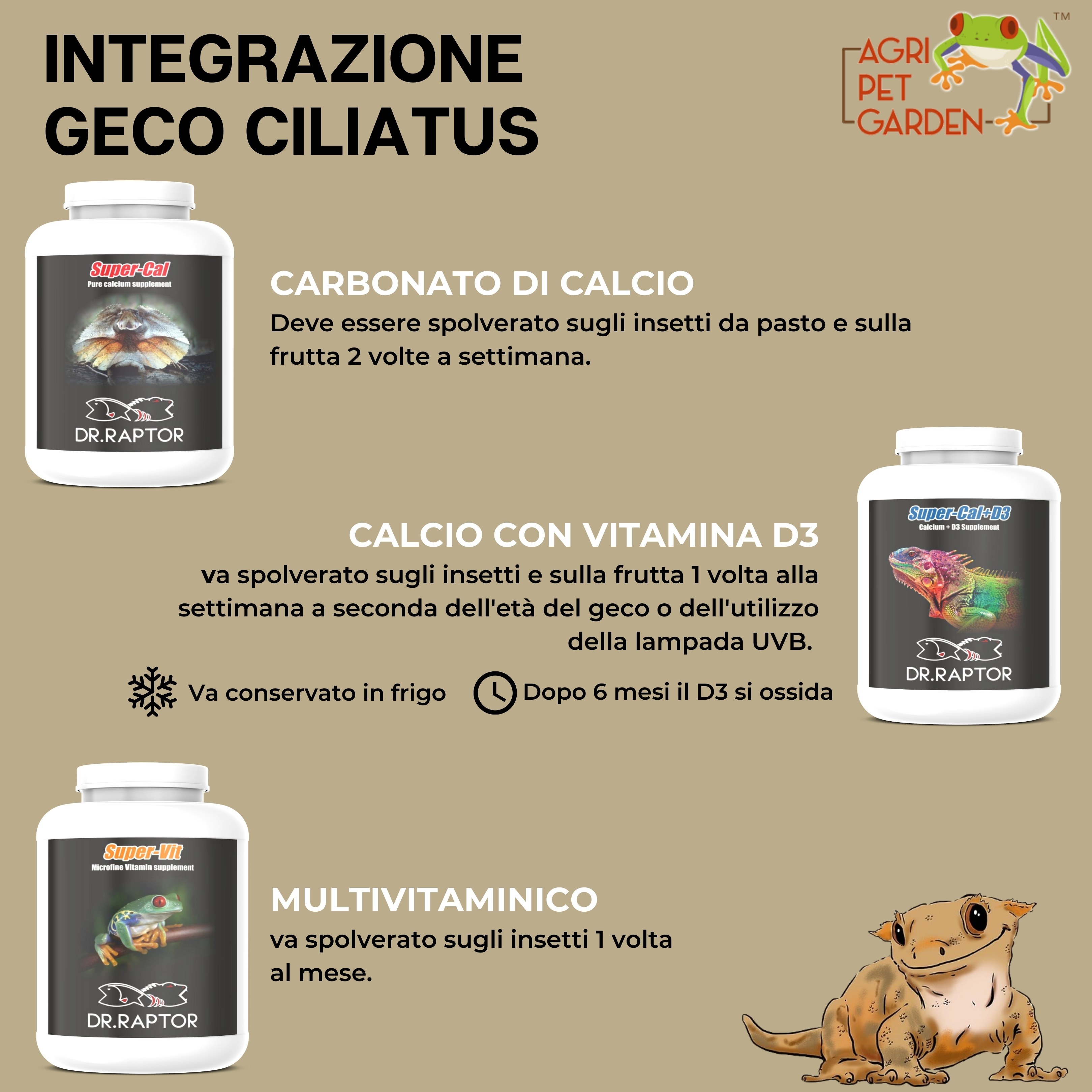Attenzione: è importante che gli insetti da pasto siano spolverati con carbonato di calcio puro e con vitamina D3; la D3 è indispensabile per tutti i rettili per sintetizzare il calcio e fissarlo alle ossa.