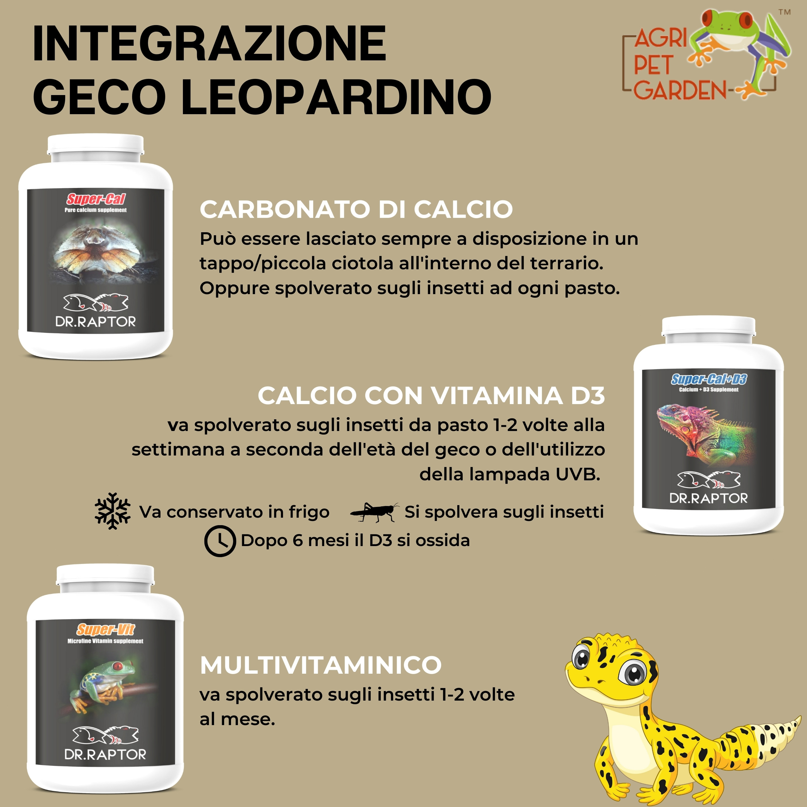 Il Calcio + Vitamina D3 va spolverato sugli insetti da pasto 1-2 volte alla settimana a seconda dell'età del geco o dell'utilizzo della lampada UVB.