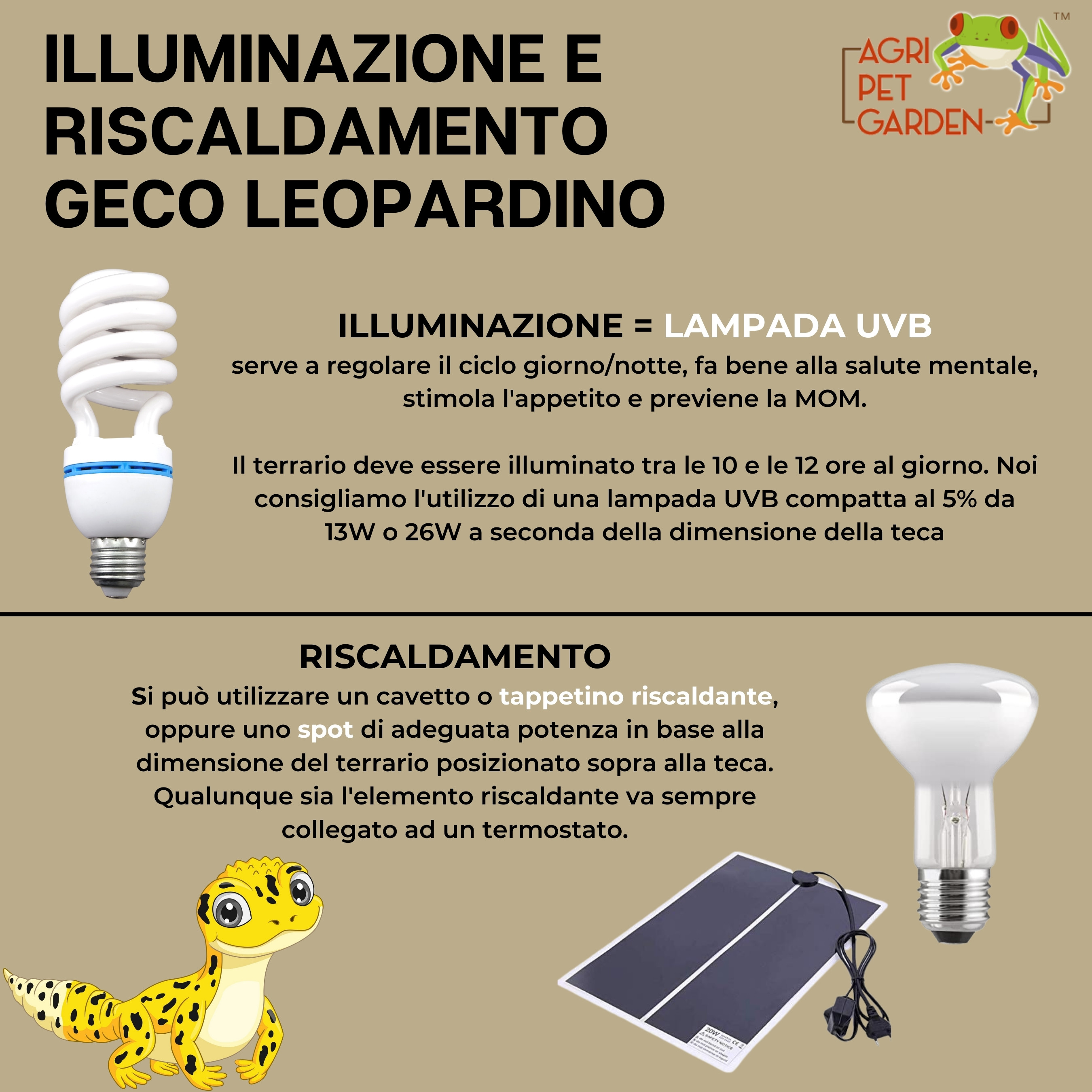 Essendo gechi deserticoli, è importante un buon riscaldamento del terrario. Come riscaldamento per il terrario del leopardino si può utilizzare un cavetto o tappetino riscaldante, oppure uno spot di adeguata potenza in base alla dimensione del terrario posizionato sopra alla teca. Qualunque sia l'elemento riscaldante va sempre collegato ad un termostato.
